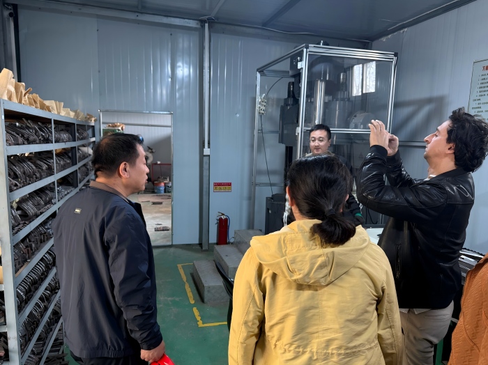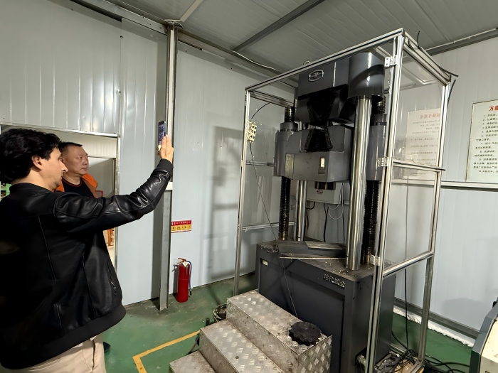 Además, el cliente visitó la planta de empaquetado del producto terminado y el taller de galvanizado. Con un medidor de zinc, midieron el espesor del recubrimiento de zinc de cada componente, que promedió más de 100 micras y cumplió con la norma ASTM-A123. El cliente también observó nuestro laboratorio físico, utilizado para inspecciones de calidad, y comprobó la resistencia a la tracción del acero Q355B.